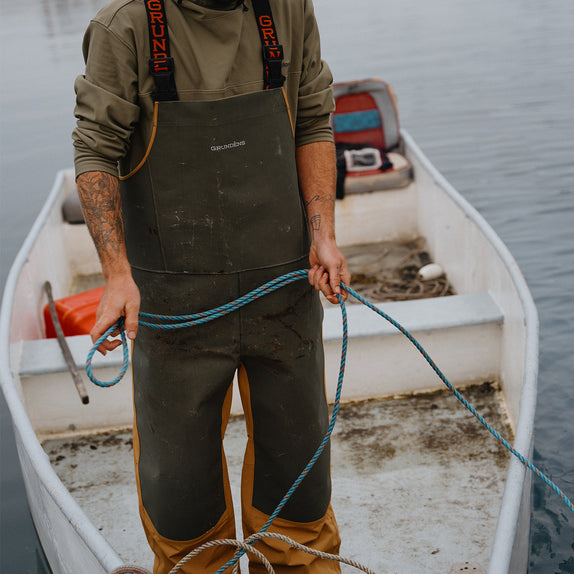 Built rugged, tough, and focused on the task at hand, the Sternman Armored Bib gets its namesake from the hard-working lobstermen of the Northeast. The 100% waterproof construction features body-mapped TPU “armor” that maximizes durability in high abrasion zones when pulling traps, harvesting catch, and working your a$$ off on deck. The thoughtful breathable shell gives back to Mother Ocean by using a recycled a 4-layer nylon made from fish nets and oyster farming. Mobility and functionality were prioritized with a gusseted crotch to remove working tension and enhance maneuverability, and interior knee pad pockets are available when you need to beef up lower body protection. Complete with internal secure storage for your personal items, the Sternman Armored Bib is equipment for the commercial fisherman.