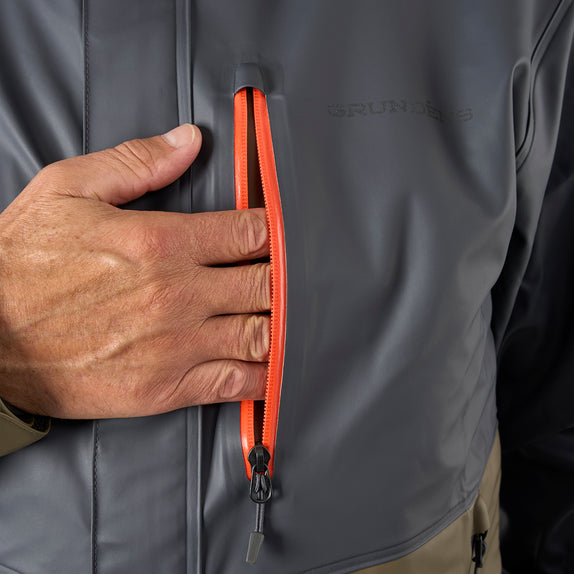Built for the die-hard angler who fishes through it all, the Tourney Pro Jacket delivers uncompromised, complete waterproof protection without sacrificing performance or price. Crafted with flexible 100% PU-coated polyester that moves with you and simply will not wet out, this jacket shrugs off blood, slime, and sea spray while integrated 3mm neoprene cuffs lock out water when the action heats up. Pit zips offer ventilation and easy access to bibs or waders, while a snag-free adjustable hood and Grundéns’ Storm Front Placket provide added defense when you’re running hard into wind and weather. Whether you’re in for long choppy boat runs or casting into sideways rain, the Tourney Pro is your professional grade shield—purpose-built to keep sport anglers dry, clean, and fully focused on the bite.