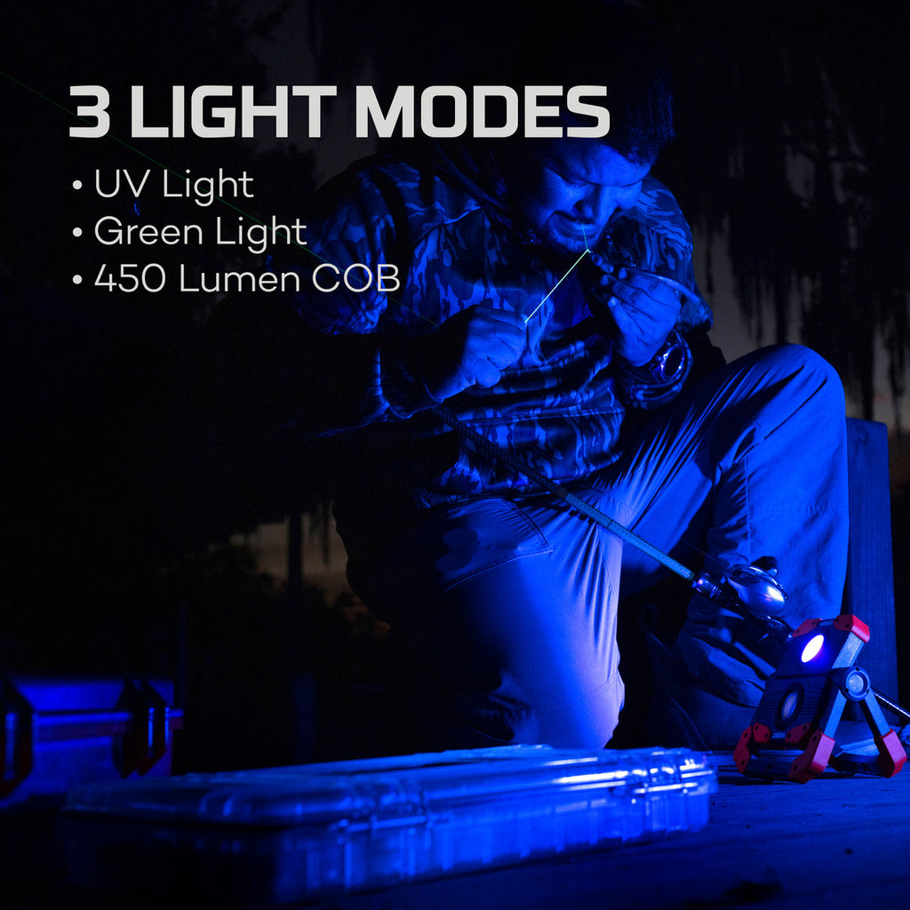 The OMNI™ Fish Dock Light is a USB-C rechargeable fishing work light that outputs white, green, or UV light. This versatile light features adjustable brightness, Smart Power Control and also serves as a power bank to charge your other USB powered devices.